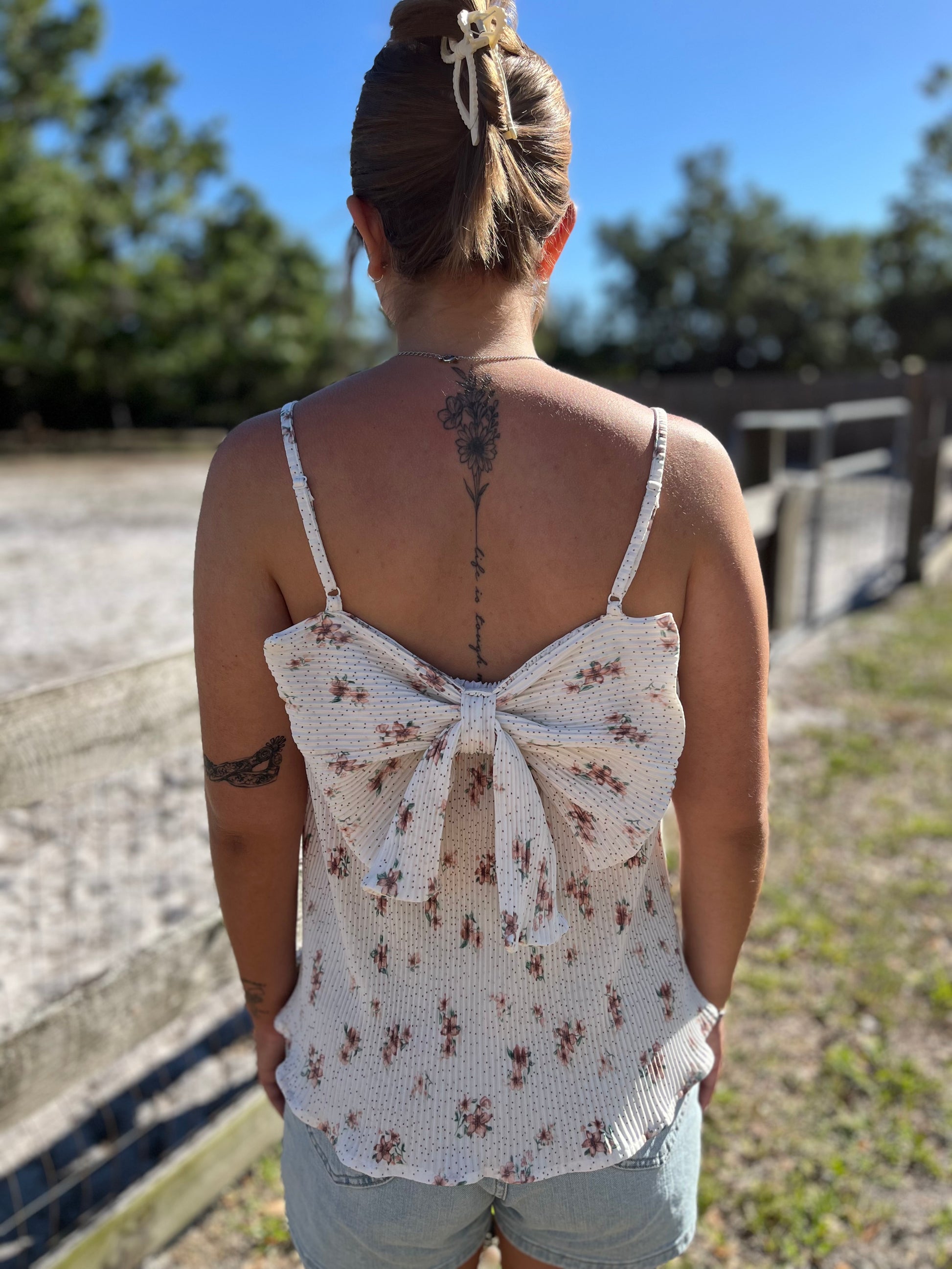 Floral Bow Back Pleated Summer Tank Top