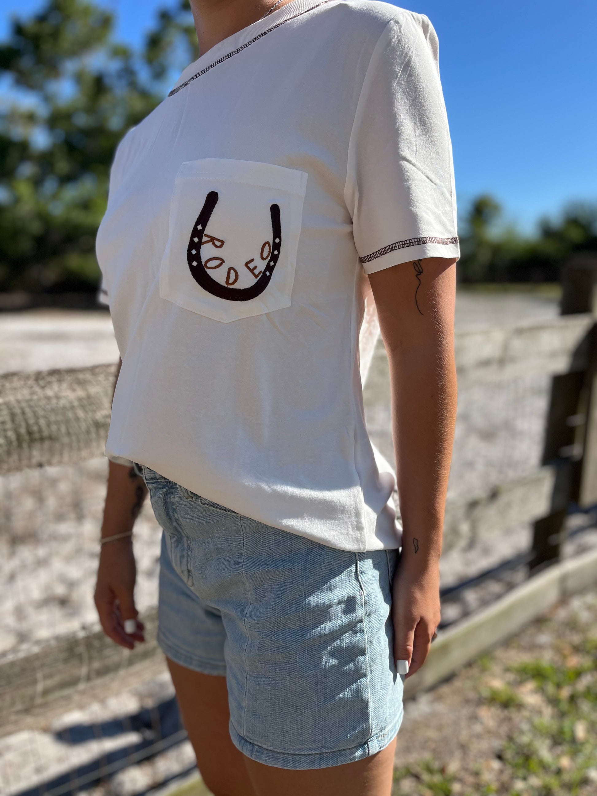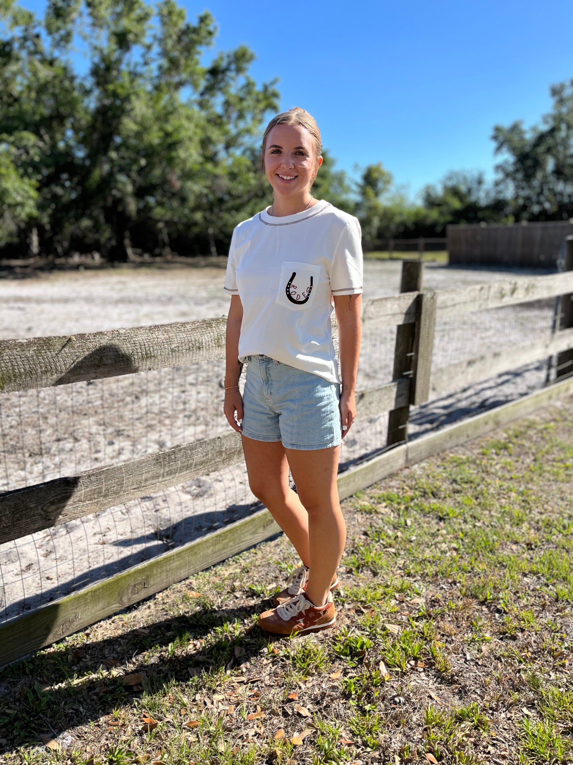 This shirt is a stylish and versatile tee that adds a trendy look to any outfit. The horseshoe patch pocket and contrast stitching design offer extra detail and a fashionable touch. Perfect for casual, holiday, or daily wear, this tee is a must-have in any wardrobe. Cotton/Spandex Size Info: US Size Range. Small 0-4, Medium 6-8, Large 10-12, XL 14-16, 2X 18-20 See size chart for approximate measurements. Model is wearing size small